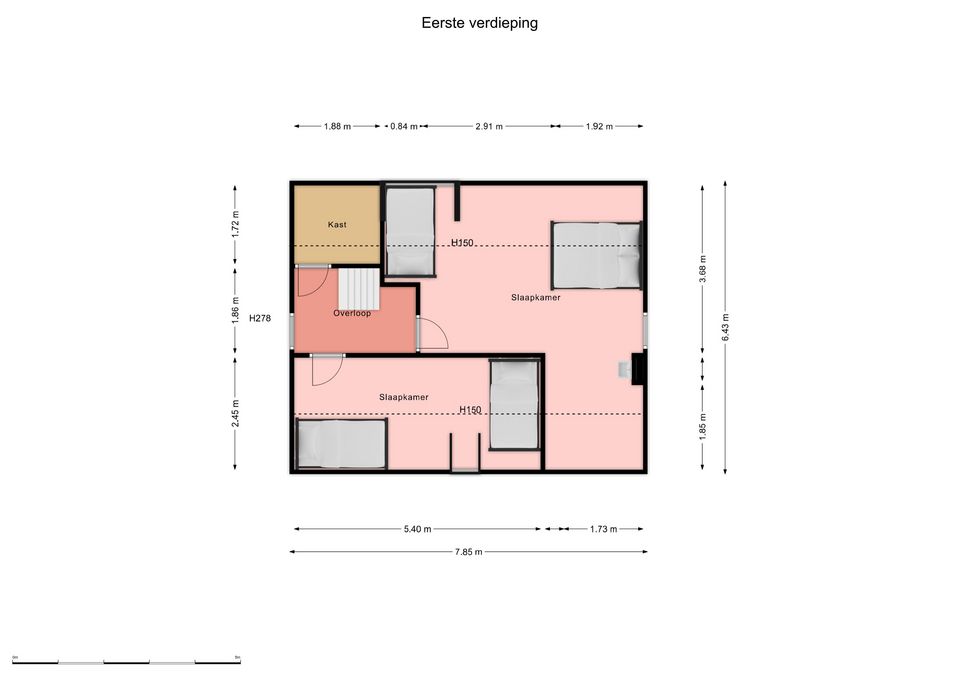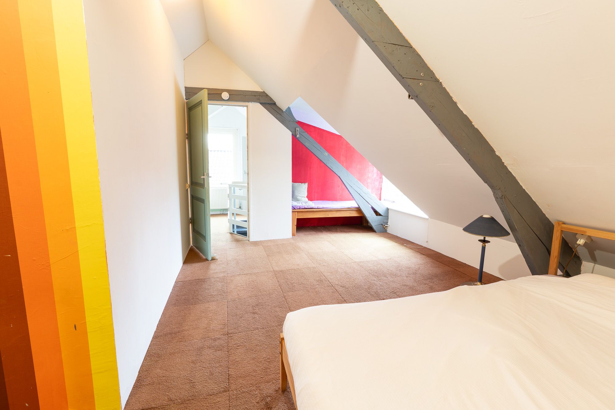 Via de trap in de hal bereikt u de eerste verdieping, een verdieping vol verrassingen en mogelijkheden. Hier bevinden zich twee slaapkamers en een opbergruimte. De hoofdslaapkamer op deze verdieping is relatief groot en voorzien van een wastafel, wat extra gemak biedt. De kamer is strak afgewerkt, maar heeft een uniek detail: de originele dakspanten zijn nog zichtbaar, wat een karakteristieke en robuuste sfeer geeft.